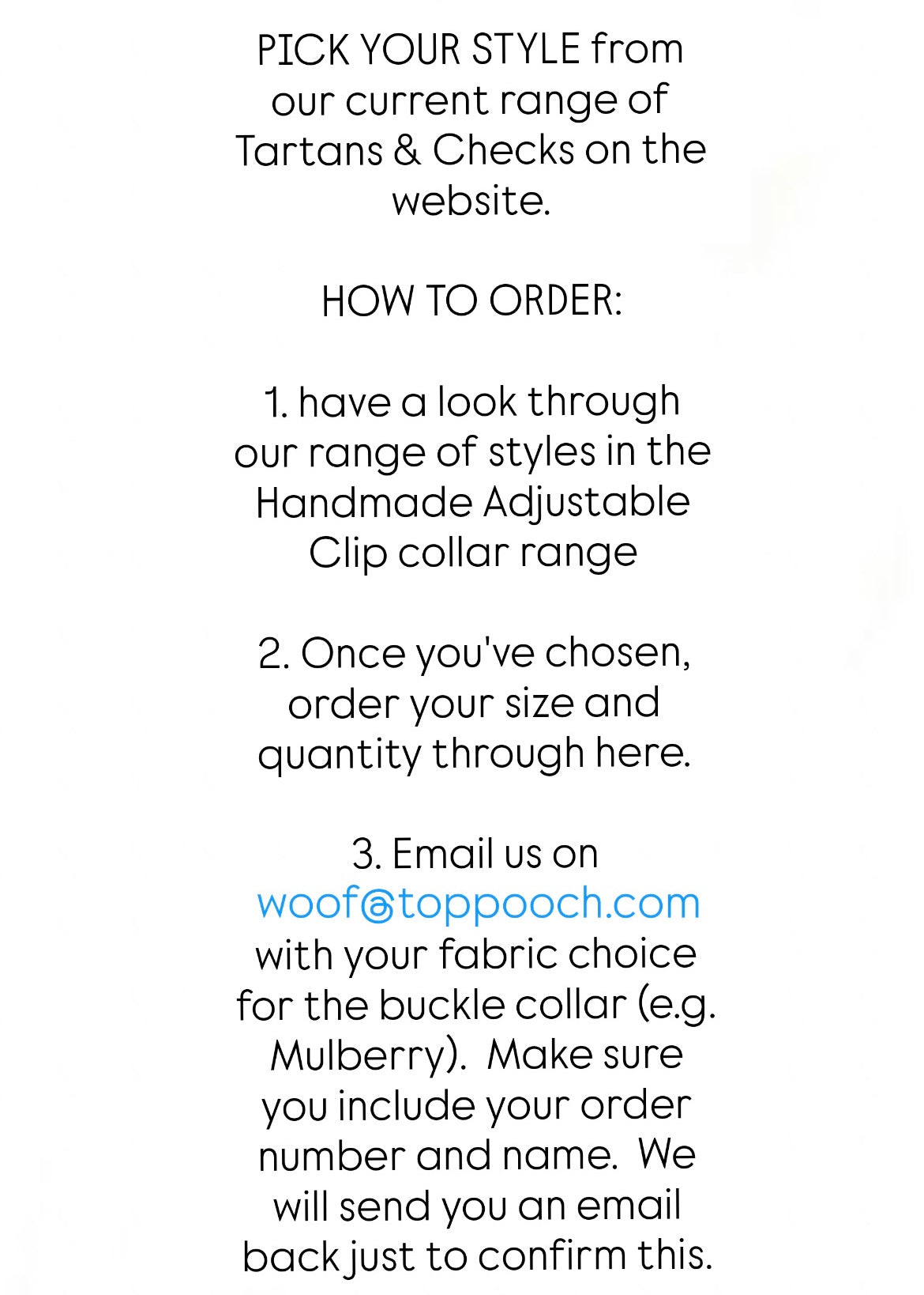 - Email us on woof@toppooch.com with your fabric choice for the buckle collar (e.g. Mulberry). Make sure you include your order number and name. We will send you an email back just to confirm this.